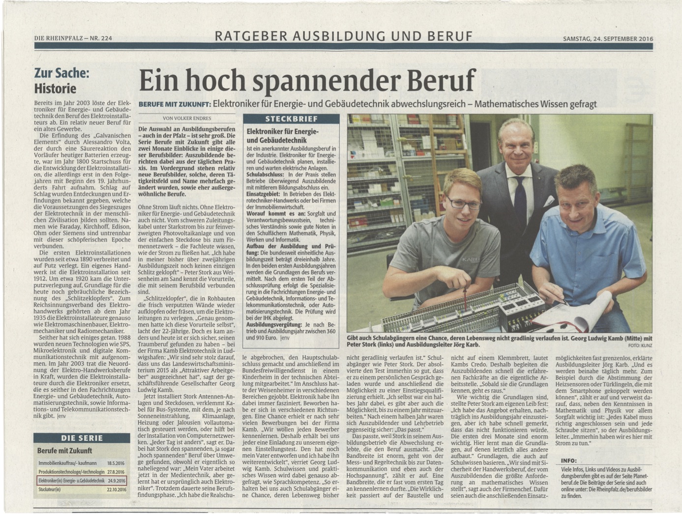 Der Ausbildungsberuf zum Elektroniker für Energie- und Gebäudetechnik ist eine hoch spannende und abwechslungsreiche Ausbildung, bei der mathematisches Wissen gefragt ist, so berichtete die Tageszeitung "Die Rheinpfalz" in ihrer Serie Berufe mit Zukunft.