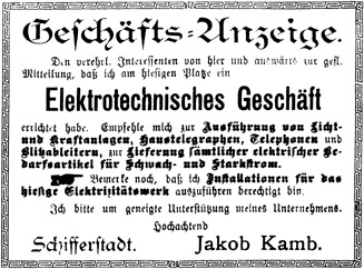 - Zusammen mit seinem Bruder, dem Elektromeister Franz Kamb, betrieben beide ein elektro- technisches Geschäft, mit einem - für die damalige Zeit - schon beachtlichen Leistungsspektrum